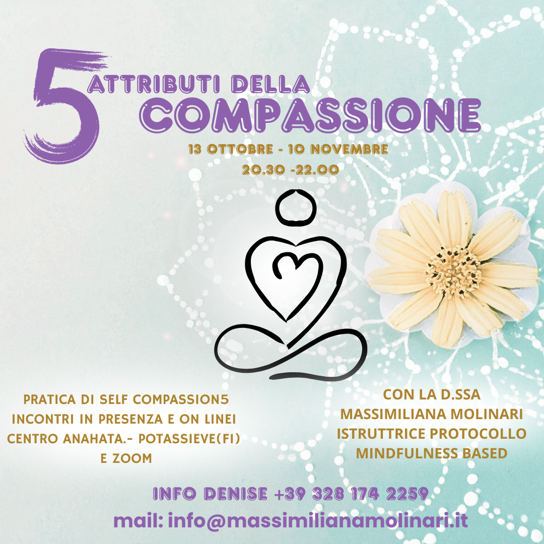 Ecco perchè ho deciso di proporre un corso di 5 appuntamenti settimanali durante i quali coltivando l’attitudine mindfulness verrà esplorata la compassione come spinta a prendersi cura di se stessi e degli altri per ridurre la sofferenza ; approfondiremo gli attributi della compassione per affrontare le emozioni, le modalità di pensiero, i comportamenti che si attivano quando siamo sofferenti, arrabbiati, impauriti/ansiosi , depressi.