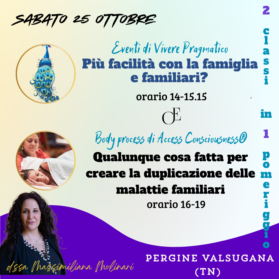 Pragmatic Living Events:Più facilità con famiglia e familiari? e/o Classe di formazione Body process® Qualunque cosa fatta per creare la duplicazione delle malattie familiari.